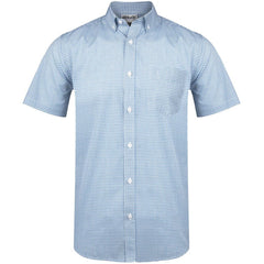 Mens short sleeve shirt. Features include a button down collar, back yoke with box pleat, left chest pocket, curved hemline